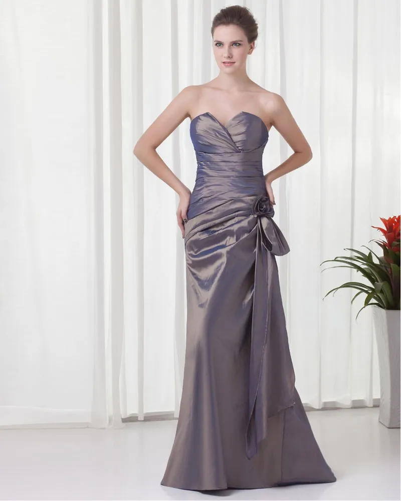 Elegant Krusning Blomsterdekorasjoner Kjaereste Gulv Lengde Taffeta Brudepikekjoler